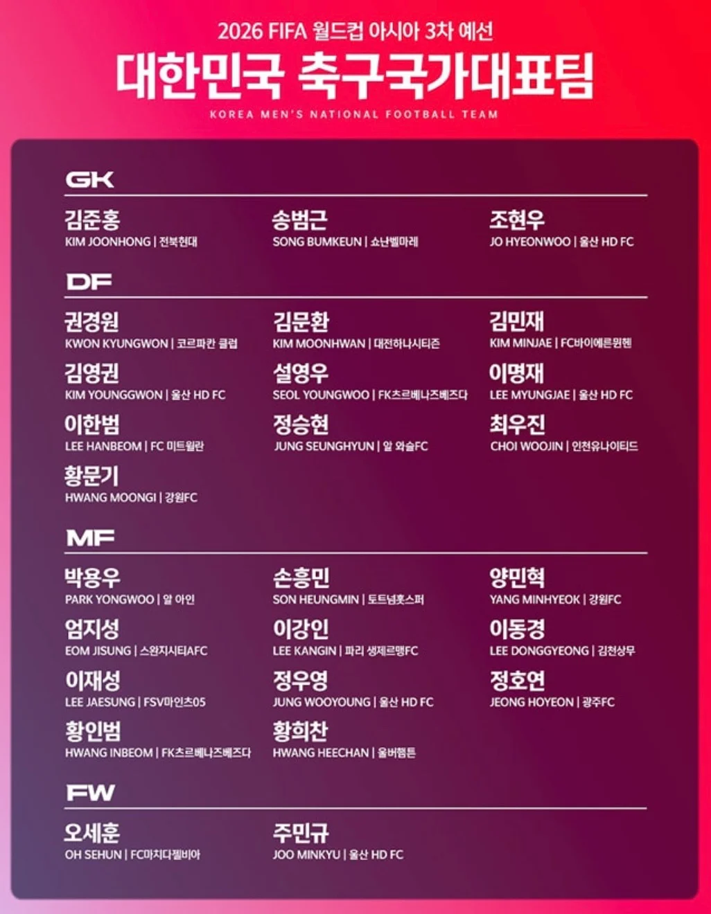 대한민국 대표팀 명단은 공격수 2명, 미드필더 12명, 수비수 10명, 골키퍼 3명으로 이번 대한민국 명단에 선택된 양민혁 선수는 가장 어리고 내년에 토트넘 FC에서 뛰기로 예정되어 있을 정도로 촉망받는 유망주입니다. 그리고 파리 생제르망 FC의 이강인 선수와 토트넘 FC의 손흥민 선수도 대한민국 명단에 포함되었습니다.