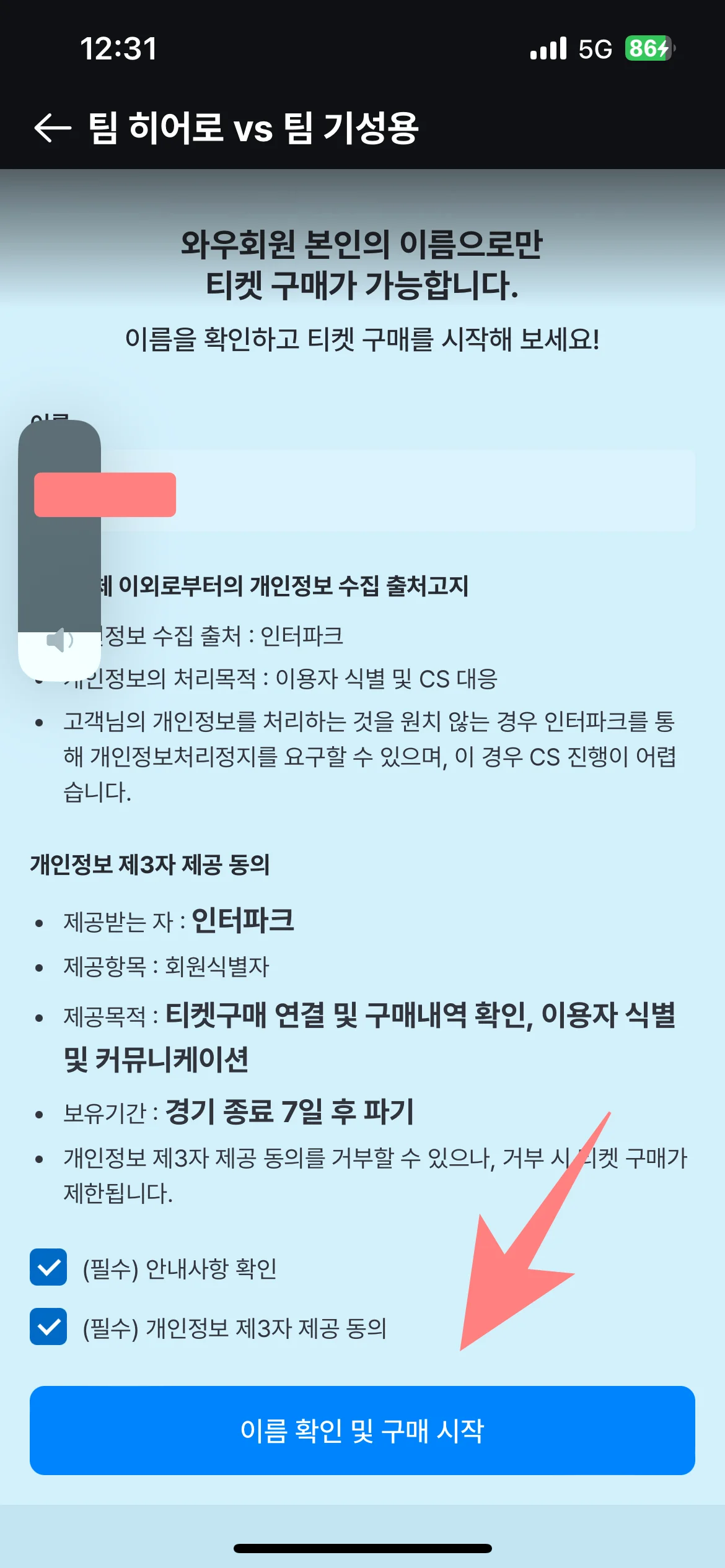 5. 본인 이름을 필히 기재하고 구매 시작 버튼을 클릭합니다.