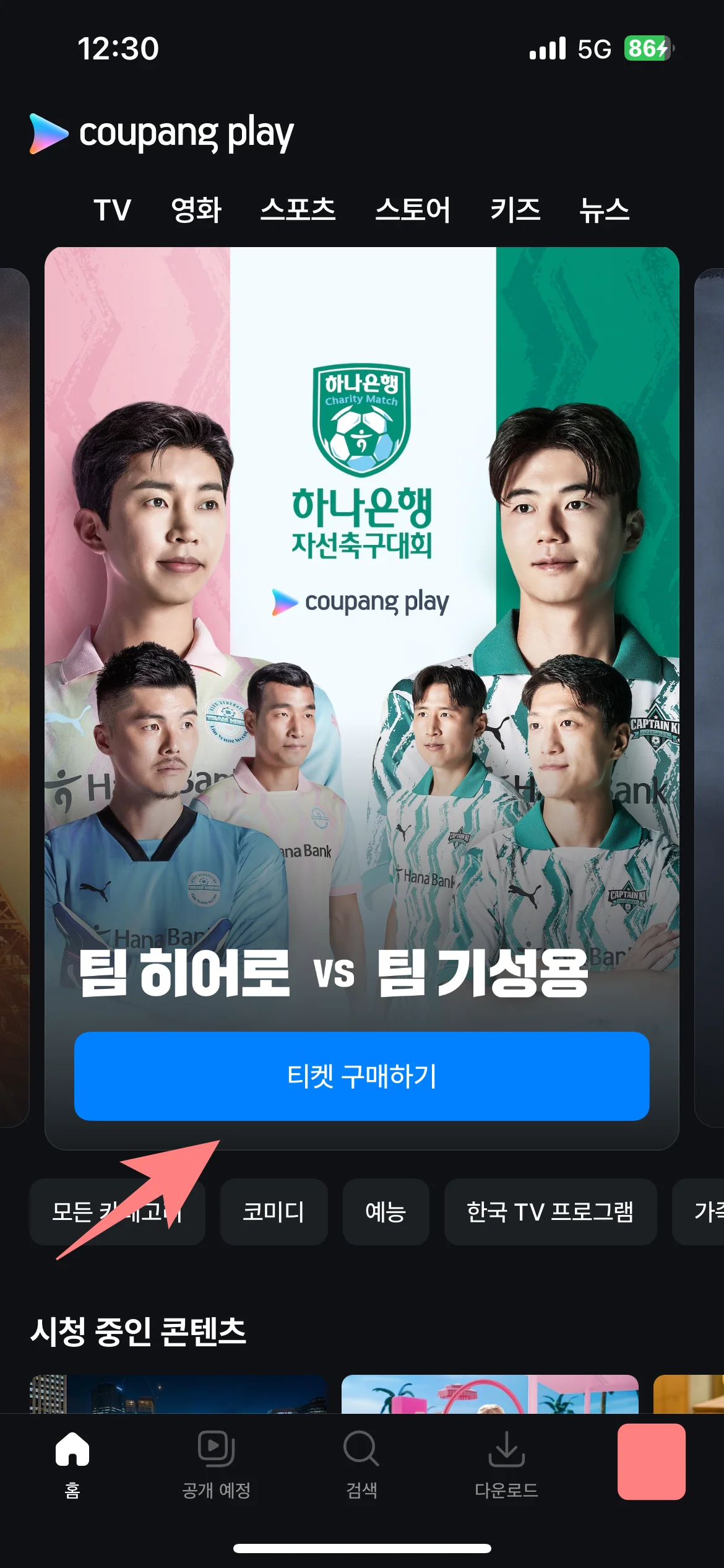 3. 쿠팡플레이 메인 화면에 팀 히어로 vs 팀 기성용 배너를 클릭합니다.