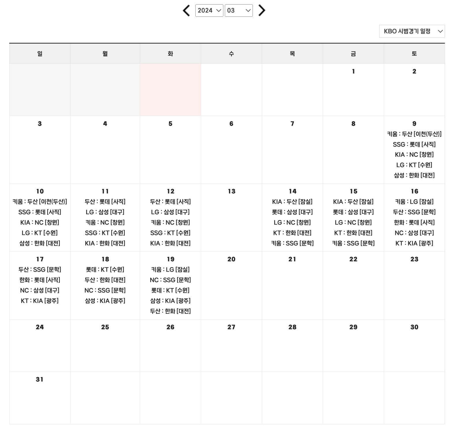 ● 시범경기 일정: 2024년 3월 9일(토) ~ 2024년 3월 19(화)