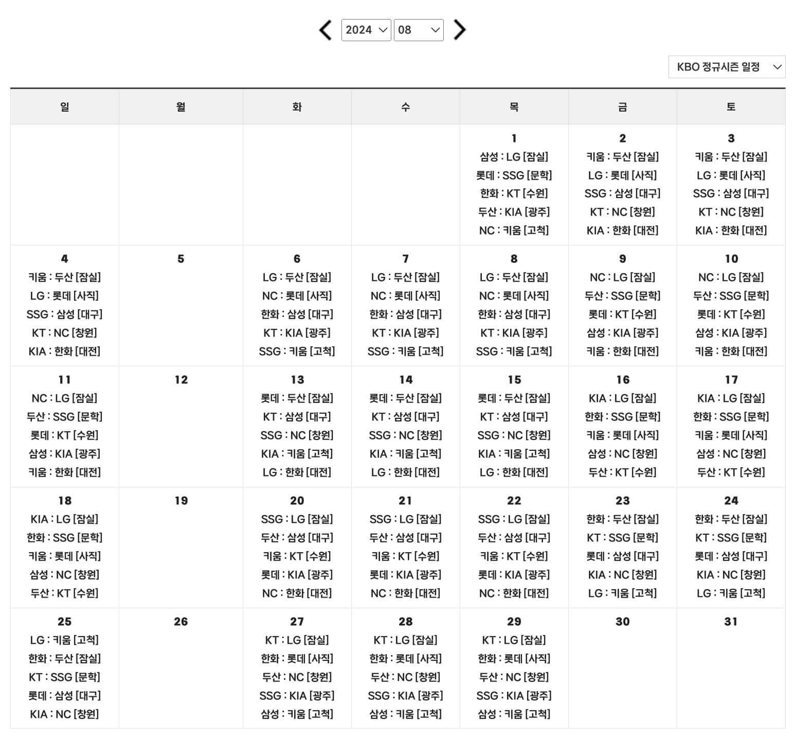 ● 정규시즌 일정: 2024년 3월 23일(토) ~ 2024년 8월 29일(목)